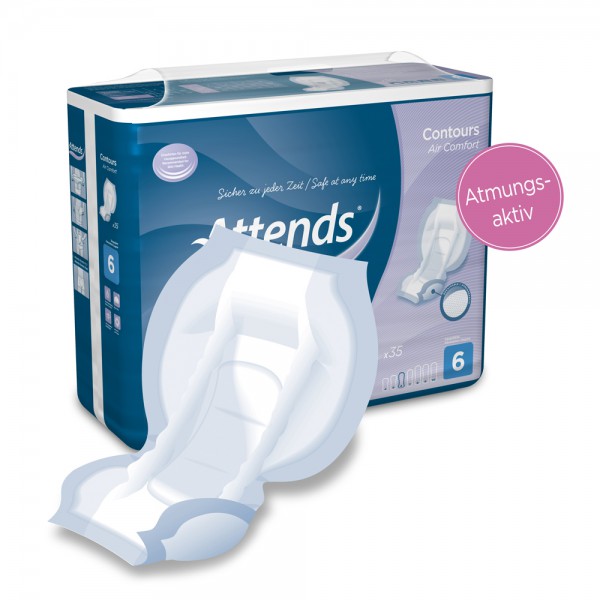 Attends Contours Air Comfort 6 Einlagen (1×35 Stück) mit anatomischer Form gewähren Ihnen bei mittlerer Blasenschwäche Sicherheit. atmungsaktiv für mehr Hautgesundheit gebogene Form und weiche Bündchen für optimale Anpassung an Körper Flüssigkeit wird sicher im Innern der Vorlage eingeschlossen baumwollartige Außenseite sorgt für ein angenehmes und gesundes Hautgefühl ohne Schwitzen mit Attends Stretch fit oder Attends Stretch pant Fixierhosen sicher am Körper zu halten Attends Odour Protection – Im Attends Kern wird das im Urin enthaltene Ammoniak sicher gebunden und eingeschlossen. Dadurch schützt Attends vor unangenehmen Gerüchen Attends Quick-Dry – Eine Aufnahmeschicht und ein darunter liegender Kern sorgen für eine schnelle Flüssigkeitsaufnahme und hohe Hauttrockenheit auch bei längeren Tragezeiten Hautfreundlicher pH-Wert 4,5 – Das Quick-Dry-System mit Aktivfasern und Supersorber sorgt für einen guten pH-Wert von 4,5. Somit unterstützt Attends die Gesunderhaltung der Haut Maße: Dicke 6,6 mm Länge 58 cm Breite im Schritt 18 cm Saugkapazität 1470 ml Saugstärke 6 Material: Oberseite Vlies Rückseite Polypropylen, Vlies Saugkern Zellstoff, Superabsorber Lieferumfang: 1 x 35 Stück Attends Contours Air Comfort 6