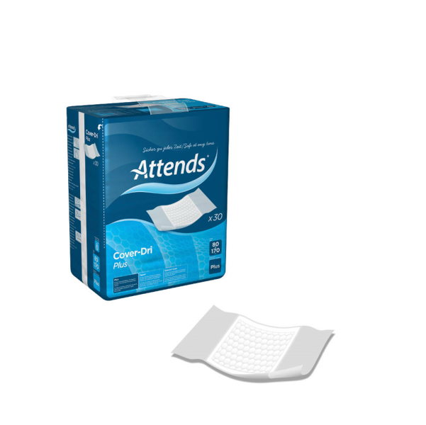 Attends Cover-Dri  5 Plus 80×170 (1×30 Stk.) Krankenunterlagen sind Einmal-Schutzauflagen mit weicher Oberfläche und besitzen in abgesteppten, rautenförmige Saugkissen den einzigartigen Attends Saugkern mit Superabsorber. Attends Cover-Dri 5 Plus Krankenunterlagen bieten somit hohe Saugkapazität bei mittlerer Verwendungsdauer. Sie eignen sich als zusätzlicher Schutz bei Verwendung einer körpernahen Inkontinenz-Versorgung. Die Krankenunterlage als zusätzlicher Schutz fürs Bett. Extra dünn und super saugstark dank der Attends Supersorber-Technologie. Das Format 80×170 cm mit Seitenflügeln eignet sich hervorragend als Stecklaken. Lieferumfang: 1×30 Stück Attends Cover Dri 5 Krankenunterlagen 80×170