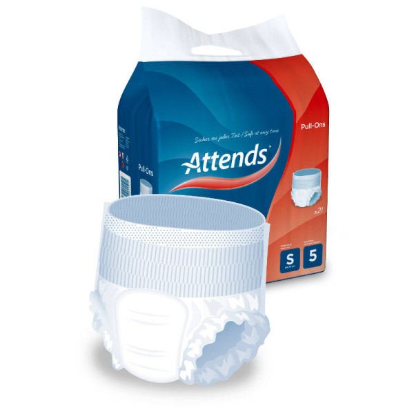 Attends Pull-Ons 5 Plus (1×21 Stk.) Einweghosen mit integriertem Saugmaterial, haben einen sehr leistungsfähigen Saugkern, der Flüssigkeit schnell aufnimmt und sicher einschließt. Sie eignen sich besonders für mittlere Blasenschwäche. Die Hose wird wie normale Unterwäsche einfach an- und ausgezogen. Durch die Attends Geruchsbindungsfunktion Odour Protection werden unangenehme Gerüche effektiv vorgebeugt. Der flexible Sitz gibt Attends Pull-Ons das Gefühl, normale Unterwäsche zu tragen. Farbe: weiß Größe: Hüftumfang: 56 – 75 cm –> Small Lieferumfang: 1×21 Stück Attends Pull-Ons 5 Plus Small