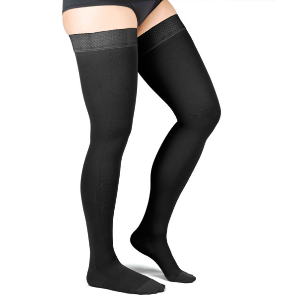 Die Compressana Nova sind unauffällige Kompressionsstrümpfe, die besoders luftig und transparent sind. Möglich wird das, indem elastische Fäden mit sehr dünnem, glattem und hautfreundlichem Polyamid umsponnen werden. Somit kann ein festes, aber gleichzeitig sehr dünnes Garn entstehen. Zudem wird nur in jeder zweiten Maschenreihe ein Kompressíonsfaden ins Gestrick eingebunden, was für zusätzliche Luftdurchlässigkeit sorgt.Ideal für den Sommer und heiße TageBeste Dehnungsreserven, besonders an den kritischen Stellen im Knie- und OberschenkelbereichHohe Haltbarkeit und TragekomfortKKL1: 3,1 – 4.3 kPa (23 – 32 mmHg)geschlossene FußspitzeNoppenhaftbandIndikationen:Krampfaderleiden (Varikose)Nach venenchirurgischen EingriffenThromboembolieThromboseprophylaxe bei mobilen PatientenChronisch Venöse Insuffizienz (CVI) Stadium 1Materialzusammensetzung:77% Polyamid23% ElastanBeinlänge normal:72 – 83 cmGröße (Fesselumfang):18 – 20 cm = I20 – 22 cm = II22 – 24,5 cm = III24,5 – 27 cm = IV27 – 30 cm = V30 – 33 cm = VIFarbe:schwarzsilkperlePflege:waschmaschinen- und trocknergeeignetLieferumfang:1 Paar Compressana Nova AG CCL2 Schenkelstrümpfe in gewählter Größe und Farbe