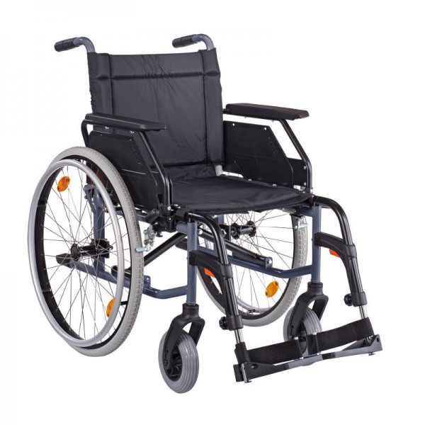 Der Standard-Faltrollstuhl CANEO_B mit Trommelbremse von Dietz erfüllt durch einen stabilen Stahlrahmen und die zweifach verstellbare Sitzhöhe die wichtigsten Grundanforderungen eines Rollstuhl-Basismodells. Kippstabilität bis 10° Rückenlehnenwinkel 3°, Sitzwinkel 3° Sitzhöhe 47 und 50 cm Sitztiefe 41 und 44 cm Kombiseitenteile – Armauflagen verstellbar in Desk- und Long-Version (nach hinten abschwenkbar) Unterschenkellänge einstellbar in 15-mm-Schritten von 42 bis 51 cm Beinstützen seitlich abschwenkbar abnehmbar Fußplatten höhenverstellbar, mit Fersenband mit Trommelbremse Antriebsrad 24 Zoll , PU inkl. Steckachse Lenkrad 7 Zoll, PU Bezüge aus hochwertigem Kunststoff Sitzbreite 48 und 50 cm mit Doppelkreuzstrebe verstärkt Farbe: anthrazit Maße: Sitzbreite (cm) 39 42 45 48 51 Sitztiefe (cm) 41 44 Sitzhöhe (cm) 50 (47) Rückenhöhe (cm) 40 Seitenteilhöhe (cm) 23 Gesamtbreite mit Trommelbremse (cm) 62 65 68 71 74 Gesamthöhe (cm) 90 Gesamtlänge (cm) 110 Gesamtlänge ohne Beinstützen (cm) 81 Maß gefaltet (cm) 31 Max. Belastbarkeit (kg) 130 130 130 140 140 Gewicht (kg) 18,4 18,5 18,8 19,5 19,8 Lieferumfang: 1 CANEO_B Faltrollstuhl mit Trommelbremse in der gewählten Ausführung
