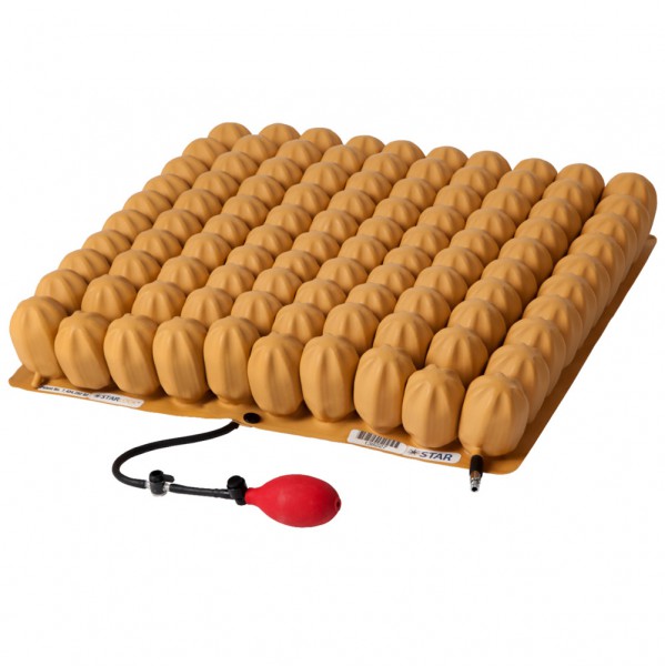 Die neuen Star Cushion Anti-Dekubitus-Kissen werden aus hochwertigem, latexfreiem Neopren gefertigt. Das Material ist antiallergisch, nicht entflammbar und durch seine dicke Wandstärke robust gegen Schäden. Durch eine verbesserte Ventiltechnik kann zudem keine Luft entweichen.Hautschutz und Positionierung:Das Anti-Dekubitus-Kissen StarLock verbindet Hautschutz und Positionierung in unvergleichlicher Weise. Bei nicht aktiviertem StarLock System hat das Kissen die Eigenschaften des traditionellen Einkammer-Luftzellenkissens. Bei aktiviertem StarLock System blockiert die Luftzirkulation zwischen den einzelnen Zellen und bildet so einen perfekten, anatomischen Abdruck des Gesäßes.Freilagerung:Die Luftzellen sind untereinander verbunden und ermöglichen die gleichmäßige Verteilung der Luft über das gesamte Kissen. Sie sind einzeln deaktivierbar und ermöglichen so ein punktuelles Entleeren einzelner Zellen zur vollständigen Entlastung kleinerer Körperzonen.Stabile Sitzposition:Mit der Doppel-Hand-Pumpe werden die Luftzellen über das Aufblasventil aufgepumpt.Mit der Handballen-Pumpe am Kissen kann dann das StarLock-System aktiviert werden. Damit kann der Luftaustausch zwischen den Luftzellen verhindert und die Position des Benutzers fixiert werden. Die Sitzposition ist jetzt fixiert, verhindert ungewolltes Rutschen und erleichtert aufrechtes Sitzen. Wenn das Sicherheitsventil so gedreht wird, dass es mit dem Schlauch ein „X“ bildet, wird verhindert, dass Luft aus dem Verriegelungssystem entweichen kann. Durch Drücken des Ablassknopfs kann Luft aus dem Verriegelungssystem entlassen werden, sodass sich diese unter den Zellen verteilt.Schutz vor bei Dekubitus:Perfekte Druckentlastung durch anatomische Sitzfläche. Das StarLock-Kissen ist temporär einsetzbar bis Dekubitus Grad IV.Keine Scherkräfte:Die blockierte Luftzirkulation sorgt für sehr stabiles Sitzen und verhindert dadurch Scherkräfte als Risikofaktor für Haut – und Gewebeschäden.Noppenhöhe:5 cm7,5 cm10 cmBreite x Tiefe:siehe AuswahlGewicht:1,3 bis 1,8 kg (größenabhängig)Farbe:GoldMaximale Belastbarkeit:Für das StarLock Positionierungs Sitzkissen gibt es keine GewichtsbeschränkungMaterial:Kissen: Neoprenrutschfester Bezug: Nylon, Spandex, PolyesterLieferumfang:1 Stück Etac StarLock Anti-Dekubitus-Kissen in gewählter GrößeInkl. Handpumpe, Handballenpumpe, Bezug, Bedienungsanleitung, ReparatursetBITTE VOR NUTZUNG GEBRAUCHSANLEITUNG BEACHTEN!