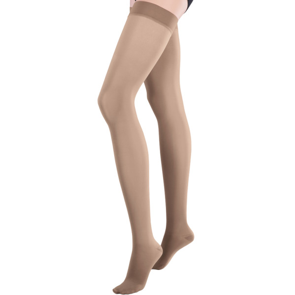 Die Juzo Inspiration Kompressions Schenkelstrümpfe haben eine transparente Feinstrumpf-Optik. Der leichte Venenstrumpf hat ein feines Maschenbild und kombiniert damit wunderbar einen modernen Look mit funktioneller Kompressionswirkung.Leicht formendOptimaler Halt durch hochwertige Elasthanfäden Atmungsaktives GestrickSchmaler Gestrickabschluss und verkleinerte Ferse für eine dezente OptikLanglebig dank durchgängig verstärkter FußsohleOhne Silikone und WeichmacherHandgefertigte Nähte für höchsten TragekomfortAnatomische PassformMit Balancehaftrand (5 cm): Mikronoppenbeschichtung aus hautschonendem Silikon, perfekt für empfindliche HautMaterialzusammensetzung:57% Polyamid43% ElasthanFarben:ZuckerSesamMandelZimtKakaoMohnBlaubeerePfefferNormale Länge:72 – 83 cmGröße (Fesselumfang):18 – 20 cm = I20 – 22 cm = II22 – 24,5 cm = III24,5 – 27 cm = IV27 – 30 cm = V30 – 33 cm = VILieferumfang:1 Paar Juzo Inspiration AG CCL2 Schenkelstrümpfe mit Balancehaftrand in gewählter Größe und Farbe