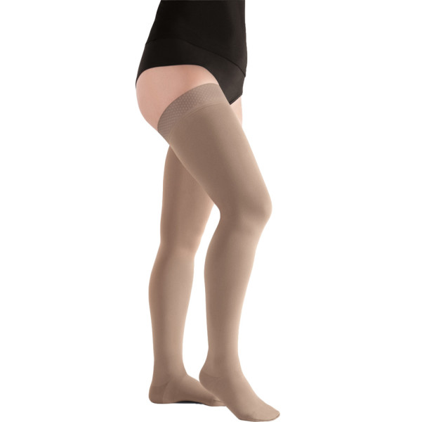 Die Juzo Move Kompressionsstrümpfe haben eine einzigartige Strickart, mit der sie sich mühelos über den Fuß und das Bein gleiten lassen. Das An- und Ausziehen ist somit einfach ohne Hilfsmittel möglich. Der Mikrofaseranteil sorgt für ein angenehmes Tragegefühl und ausgleichendes Hautklima. Die Strümpfe haben zudem eine Funktionszone im Ristbereich, die ein Einschneiden auch in einer 90 Grad Fußhaltung minimiert.Strapazierfähig und höchst komfortabel Hoher Arbeitsdruck (widerstandsfähig bei hoher Belastung, wie Laufen)Sehr kurzzügig (dehnbar)Größere Ferse für eine leichtere HandhabungSpezielle Gestrickbindung am VorfußbereichGeschlossener FußMit Noppenhaftrand 5 cm:Silikonnoppen für gute AdhäsionVerhindert RutschenLuft kann gut zirkulierenCCL2:23 – 32 mmHgNormale Länge:72 – 83 cmMaterial:75% Polyamid25% ElasthanAnleitung