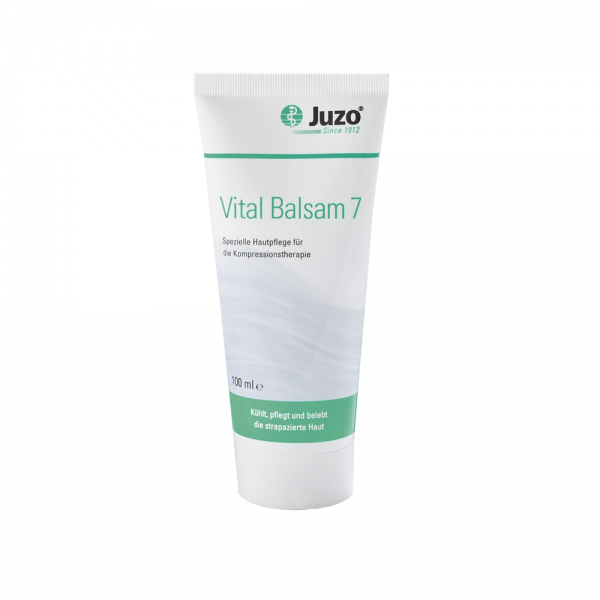 Juzo Vital Balsam 7 ist ein spezielles und hautfreundliches Emulgel entwickelt für Menschen, die Kompressionsbekleidung tragen. Durch die Vorteile eines Gels mit den besonderen Eigenschaften einer Creme mit hochwertigen Wirkstoffen, wie Panthenol, Vitamin E und Menthol.Panthenol – glättet Ihre Haut und macht diese geschmeidig.Vitamin E – aktiviert den Schutz gegen Umwelteinflüsse und freie Radikale.Menthol – bewirkt das belebende und kühlende Frischegefühl.Naturextrakte aus rotem Weinlaub, Rosskastanien und Arnikablüten fördern die Durchblutung.Anwendung:Juzo Vital Balsam 7 morgens vor dem Anziehen des Kompressionsstrumpfes und abends nach dem Ausziehen auf das Bein zur Hautpflege auftragen.Durch leichtes Einmassieren des Balsams beginnend am Knöchel bis zur Hüfte wird gleichzeitig die Hautdurchblutung gefördert.Zusammensetzung:Aqua, Alcohol denat., Propylene Glycol, Panthenol, Tocopheryl Acetate, Aesculus Hipoocastanum (horse chstenut) seed extract, Vitis vinifera (grape) leaf extract, arnica montana flower extract, Menthol, Maltodextrin, Acrylates C10-30 Alkyl acrylate crosspolymer, PEG-40 hydrogenated castor oil, Sodium hydroxide, Citric acid, Limonene, Linalool, Citronellol, Geraniol, ParfumInhalt:100 mlLieferumfang:1×100 ml Juzo Vital Balsam 7