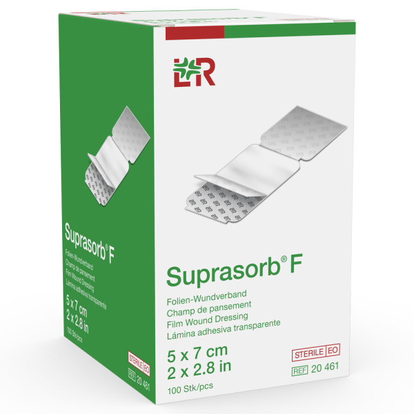 Der L&R Suprasorb F Folien-Wundverband ist selbstklebend und transparent. Er kann sich den Körperkonturen ideal anpassen und bietet einen hohen Tragekomfort. Durch seine Transparent ist eine gute Wundkontrolle möglich. Das frische Epithelgewebe wird gut vor äußeren Einflüssen, wie Keimen und Flüssigkeit, geschützt.Hält ein feuchtes Wundmilieu aufrecht und unterstützt somit die WundheilungEinfache ApplikationHoher Tragekomfort durch sicheren und flexiblen HaltDehnbar und anschmiegsamWasserdichtSterilGröße:5×7 cmIndikationen:für die Versorgung von nicht-infizierten Wunden, wenn diese schwach exsudierend und oberflächlich sindzum Schutz von frischem Epithelgewebeals Sekundärverbandzur Prophylaxe (zum Beispiel Dekubitus)zur FixierungWundheilungsphase:EpithelisierungsphaseProduktzusammensetzung:Polyurethanfolie, PolyacrylatklebstoffTragedauer:max. 5-7 TageLieferumfang:1×100 Stück L&R Suprasorb F Folien-Wundverband steril 5×7 cm