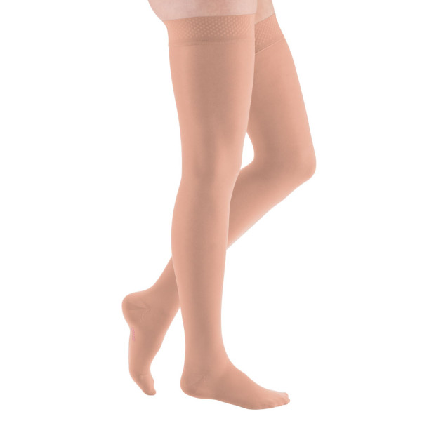 Die mediven elegance Schenkelstrümpfe sind besonders weich und in vielen schönen Farben erhältlich. Sie haben einen elastischen Strickfaden, der für weniger Druckempfinden sorgen soll.Mehr Zehenfreiheit und Komfort im Vorfußbereich durch Soft-Elastic-Fußspitze Sehr angenehmes Gefühl in der KniekehleBesonderes hautfreundlichVerkleinerte Ferse für faltenfreien SitzNoch unauffälliger im SchuhBesondere Haltbarkeit durch doppelte FersenverstärkungBesonders breites und weich gearbeitetes Bündchen für perfekten Halt und ein angenehmes TragegefühlKompressionsklasse II: Kompression in mmHg: 23,0 – 32,0, Kompression in kPa: 3,10 – 4,30Geschlossene FußspitzeVariante mit Flächen-Haftband Rose (FBR):Vorher Topband platinum (Tbp)Zuverlässiger Halt durch flächige BeschichtungElegantes, feminines DesignFeine, dünne Haftband-QualitätLänge:normal: 72 – 83 cmGrößen (Fesselumfang):18-20 cm = I20-22 cm = II22-24 cm = III24-26 cm = IV26-28 cm = V28-30 cm = VI30-32 cm = VIIFarbe:schwarzweißanthrazitmedi magentacaramelbeigerosébronzemarinecashmereMaterial:39% Elastan61% PolyamidIndikationen:Varikoseprimäre und sekundäre VarikoseVarizen in der SchwangerschaftDie Sklerosierungstherapie unterstützendNach venenchirurgischen Eingriffen Chronische Veneninsuffizienz (CVI) des Stadiums I nach Widmer bzw. C1 und C2 nach CEAPThromboseprophylaxe bei mobilen PatientenThrombophlebitis (superfiziell) sowie Zustand nach abgeheilter PhlebitisLieferumfang:1 Paar mediven elegance CCL2 AG FBR Schenkelstrümpfe