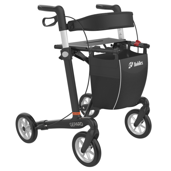 Der Mobilex Leichtgewichtrollator Gepard hat einen Carbon-Rahmen mit Aluminium-Bestandteilen und ist damit besonders leicht und wendig.Mit Kreuzgelenk zum ZusammenfaltenMit TransportsicherungVariante mit weichen SofträdernZwei FeststellbremsenFarbe:schwarzlilagelbMaße:Sitzhöhe (Größe): 62 cmGesamtbreite: 66 cmGesamtbreite gefaltet: 22,5 cmSitzbreite: 46 cmGriffhöhe (einstellbar): 74 – 102 cmGesamthöhe gefaltet: 79 cmMax. Belastbarkeit: 150 kgMax. Belastbarkeit Tasche: 5 kgGesamtgewicht (ohne Tragetasche): 5,5 kgLieferumfang:1 Stück Mobilex Leichtgewichtrollator Gepard mit SofträdernInkl. Einkaufstasche, Ankipphilfe, Rückengurt und Stockhalter