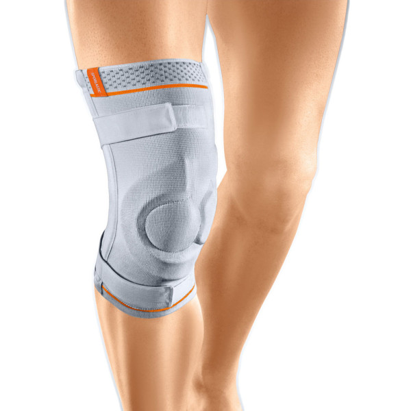 Hierbei handelt es sich um die Sporlastic Patelladyn Kniebandage, die bis Juli 2023 erhältlich war (Vorgängermodell) – wie auf dem Foto abgebildet!Wirkungsweise:Aktiv-muskuläre und passive PatellamedialisierungInfrapatellarer Druck über den caudalen Ringanteil führt zu schnellerer und kräftigerer muskulärer Tonisierung mit Betonung des M. vastus medialis und damit zu muskulärer PatellamedialisierungDie Patella wird zusätzlich über den lateral positionierten Halbring und mit Hilfe der beiden Zügel passiv zentriertTechnik:Spezifische Pelottenkonstruktion zur gezielten TherapieKonturierter, großer lateraler Silikonhalbring medialisiert und führt die PatellaKleine, mediale Silikonpelotte unterstützt Zentrierung der PatellaNahezu faltenfreier Sitz in der Kniekehle durch ZiehharmonikaeffektIndikation:Patellalateralisation (Subluxation) bei Chondropathia patelae oder GonarthroseRezividierende bzw. habituelle PatellaluxationKreuzbandinsuffizienzFarbe:platinumGröße: (Bitte Bein-Umfang bei Größe d und f wie unten stehend messen)Maß “d”: 14 cm von Kniemitte nach unten abmessen und UMFANG an dieser Stelle ermitteln.Maß “f”: 14 cm von Kniemitte nach oben. Auch hier dann Umfang messen.GrößenMaß dMaß f1bis 28cmbis 38cm2bis 31cmbis 41cm3bis 34cmbis 44cm4bis 37cmbis 47cm5bis 40cmbis 50cm6bis 43cmbis 53cm7bis 46cmbis 56cmLieferumfang:1 Stück Sporlastic Patelladyn Kniebandage
