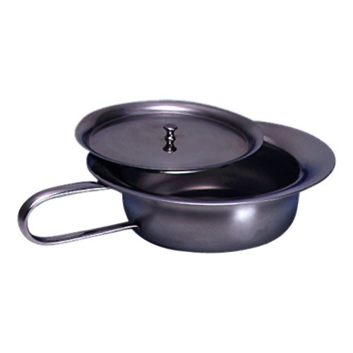 Das Steckbecken mit Deckel besteht aus rostfreiem Edelstahl. Es hat einen Durchmesser von 30 cm und eine Höhe von 7,5 cm Fassungsvermögen 1 Liter Es ist autoklavierbar