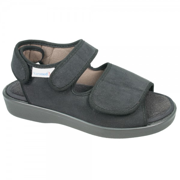 Die Varomed Sandale LUGANO (schwarz) eignet sich für Verbände und Verletzungen am Fuß. Eine Sandale für Patienten mit Wunden, Verletzungen oder Deformationen im Zehenbereich. Sehr variabel durch die drei Klettverschlüsse. Sehr weiches Obermaterial. Beim Modell Lugano ist die 6 mm starke Schaumpolsterung bereits eingelegt. Nahezu vollständig zu öffnen Optimale Trageeigenschaften, selbst bei Trägern starker Verbände Auswechsel- und waschbare 6mm-Weichschaum-Einlegesohle mit Frotteeauflage Material: Microvelours und Vliesfutter Farbe: schwarz Größe: Weite: L (sehr weit) siehe Auswahl Lieferumfang: 1 Paar Varomed LUGANO Sandalen